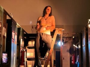 Más adelante, el pasillo del archivo se enciende con Lengua de paraguatá, de Carlos Peláez, un homenaje a la cultura marrón. Sobre lo alto de una escalera, Adrián Niklinski interpreta a José I. Marín, indio hermafrodita juzgado en 1784. Asistente de un sacerdote jesuita, vivió con él un amor clandestino, ardiente y culposo. En ese territorio de fracturas surge María Ignacia —hembra pez en cuerpo de hombre—, figura que encarna el deseo y la ruptura, siempre al borde del margen.